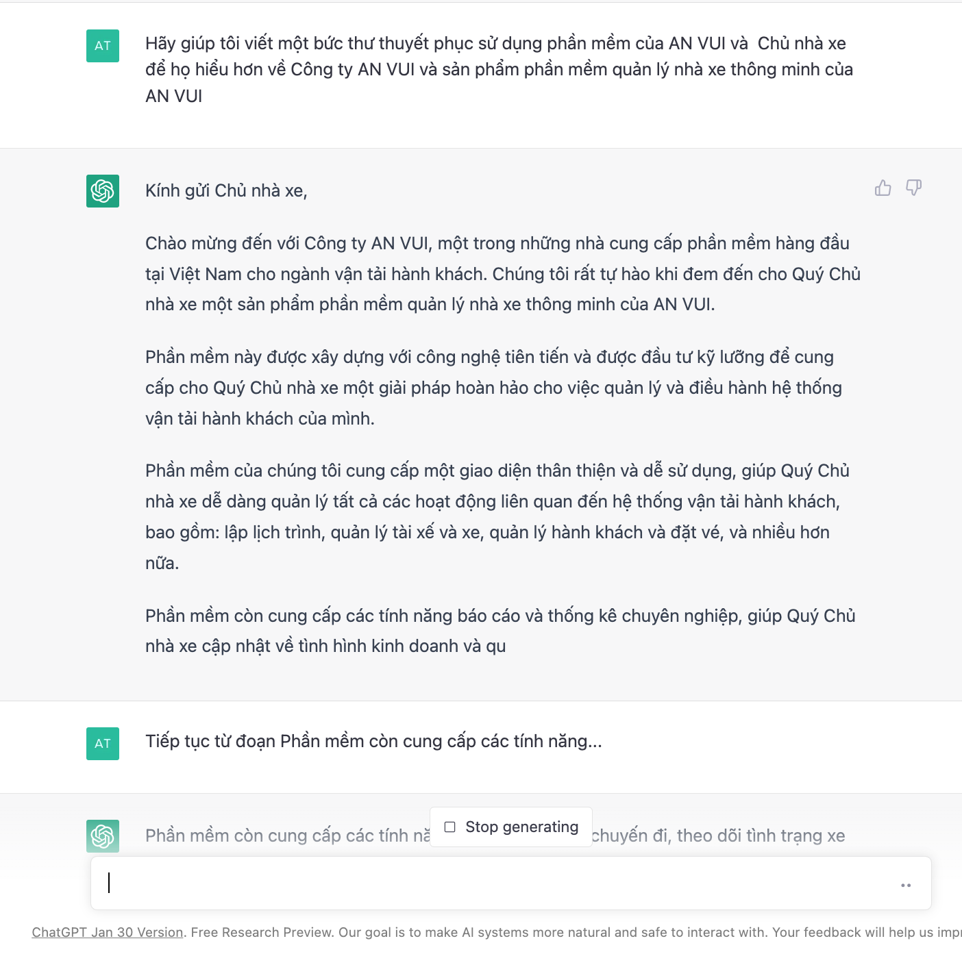 Khi được hỏi về "Hãy giúp tôi viết một bức thư thuyết phục Chủ nhà xe để họ hiểu hơn về Công ty AN VUI và sản phẩm phần mềm quản lý nhà xe thông minh của AN VUI thì Chat GPT trả lời như sau?