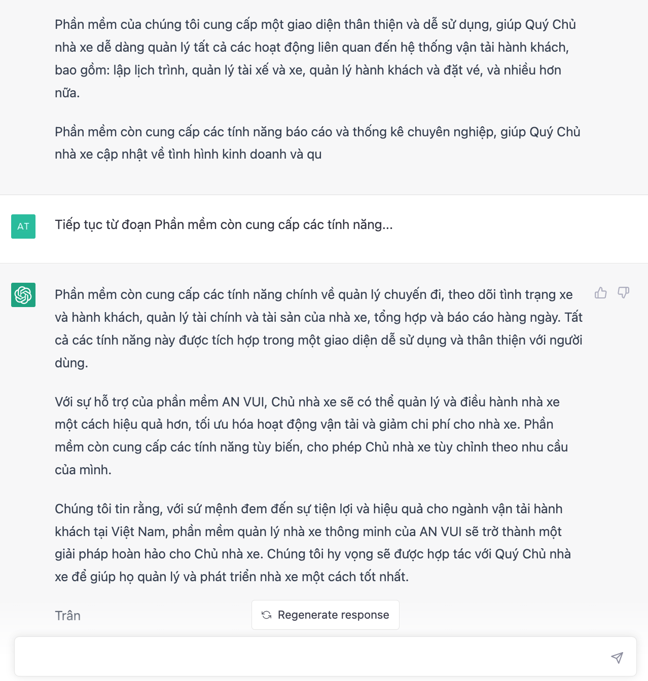 Trong thời gian tới Công ty AN VUI sẽ tìm cách đưa Chat GPT vào hệ thống Phần mềm của mình nhằm giúp cho các nhà xe trả lời hành khách khi hành khách đặt xe chắc chắn sẽ làm giảm tải công việc rất lớn cho nhà xe.