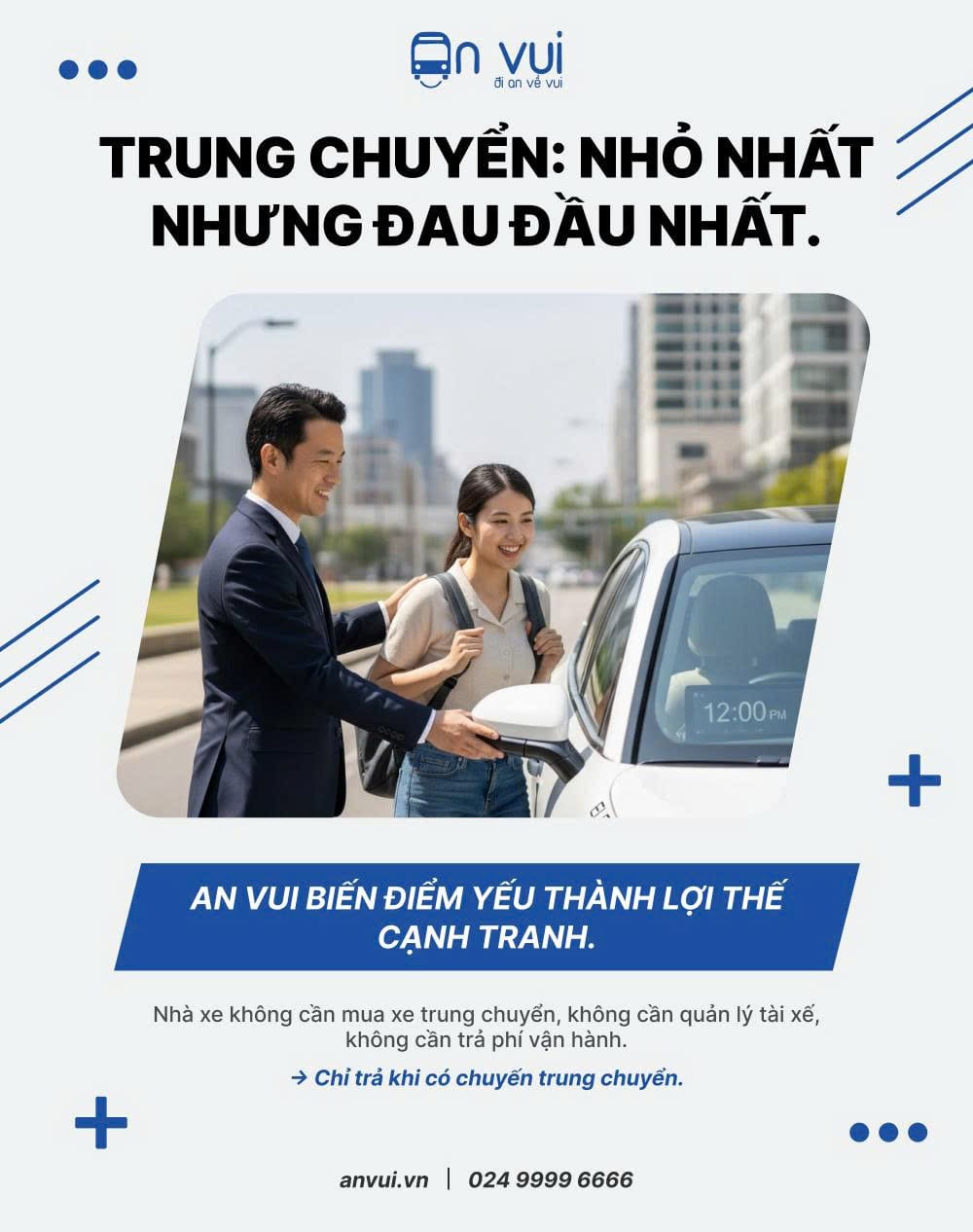 Trung chuyển là một khâu nhỏ nhưng thực sự quyết định rất lớn trong trải nghiệm của hành khách. Chính vì vậy mà AN VUI quyết định cung cấp dịch vụ này để chia sẻ khó khăn với Nhà xe. Đây cũng là bài toán lớn mà các doanh nghiệp vận tải hành khách đường dài đau đầu chưa tìm được lời giải.